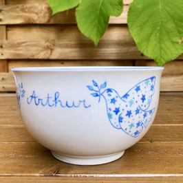 Bol avec deux colombes remplies d'un semis d'étoiles en ton sur ton (de bleu, rose vert ou violet) , de chaque côté du prénom.